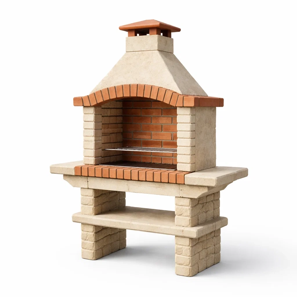 Fonctionnalités: Barbecue fixe avec foyer ouvert, cheminée pour évacuation de la fumée.